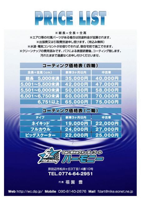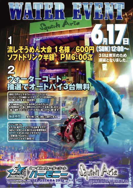 ☆イベント内容☆ ●流しそうめん大会 一名様/600円 ●ソフトドリンク半額 PM6:00迄 ●ウォーターコート 抽選でオートバイ3台無料 ウォーターコートのHP http://www.watercoat.co.jp/ 通常2万円以上するウォーターコートによる コーティングを抽選により オートバイ3台を無料にて 当日施工致します♪(保証書付) また抽選漏れの方にも当日申し込みの方には 出張費無料♪+施工費用20%OFFにてお受け致します^^ (施工場所スキッシュエリア・6月中に施工の方に限) 抽選時間