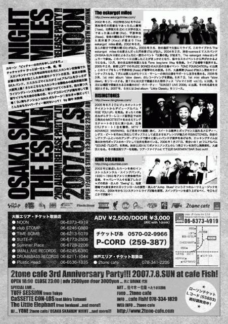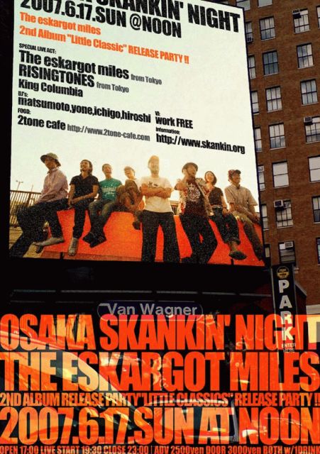 OSAKA SKANKIN' NIGHT 6/17(SUN)@CLUB NOON 〜The eskargot milesリリースパーティー!!!〜 【SPECIAL LIVE】 The eskargot miles(from Tokyo) RISINGTONES(from Tokyo) King Columbia 【DJ】 Matsumoto,Yone,Ichigo,Hiroshi 【VJ】 work FREE 【FOOD】 2tone cafe OPEN 17:00〜CLOSE 23:00 adv 2500yen door 3000yen(共にW1D) 【Ticket】 チケットぴあ Pコード(259-387) & 2tone cafe&他にて発売中! 【info】 http://www.skankin.org 【コメント】 カキーン 「ピッチャーの交代