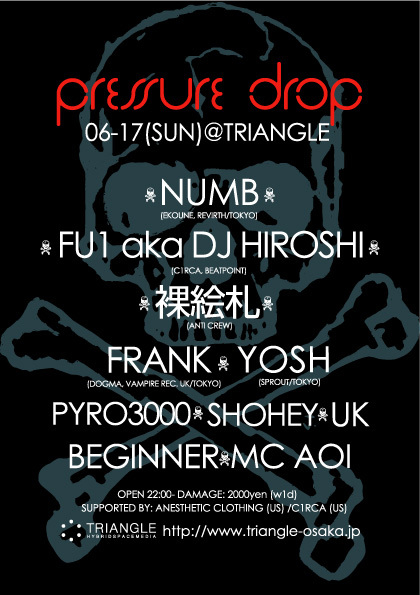 !!!!!! 06.17.(SUN) PRESSURE DROP feat.NUMB @ TRIANGLE タイムラグなく最先端、世界水準のINDUSTRIAL, FUTURE BEATZを体感できるHYBRID HARDCORE BREAKBEATZ SESSIONS【PRESSURE DROP】。 LIMEWAX来日からはや半年、07.06.17.(SUN)よりPRESSURE DROP 2nd MOVEMENTが始動 す る。 WELCOME TO THE REAL WORLD...FEEL THE PRESSURE DROP!! 07.06.17.(SUN) HYBRID HARDCORE BREAKBEATZ SESSIONS 【PRESSURE DROP】 @ TRIANGLE [[CAST]] GUEST LIVE: NUMB (EKOUNE, REVIRTH/TOKYO) NUDE TRUMP aka 裸絵札(ANTI CREW)