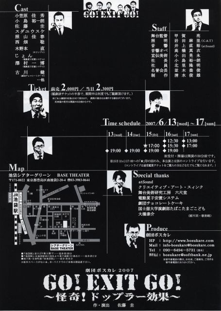 『私を小劇場へ連れてって』彩メンバーで劇場をジャック!(笑)企画の2007年第3弾です!! 彩でおなじみの「オガッチ」主演の舞台をみんなで観に行きましょう〜♪ 劇団ボスカレ2007・6月公演 『GO!EXIT!GO! 〜怪奇!ドップラー効果〜』 詳細はこちらで↓(劇団ボスカレ ホームページ) http://bosukare.com 前回のオガッチ客演舞台「抜かりない奴らに、ジレンマ」 でハラをかかえて笑ったアナタ! 前回のボスカレ舞台「スプーン戦争」でそこらじゅうのスプーンを曲げてしまったアナタ!! 今まで「小劇場には行ったことが
