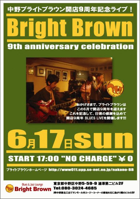 こんばんは!!!!! 来る6月17日(日) BrightBrown 9周年記念企画BAND&SESSION「Bluesの長〜い夜」を開催致します!!! 私は当日司会進行のよーすけと申します!!m(_ _)mドーゾヨロシク!!!! 今回も火、土、日とライブをやっているBandを中心に5Bandほど出演します!! 決まっている主な出演者は・・・・・・・ BLUES'n CURTAIN Band TEXAS HURRICANE TAKE★WOO 金田“デルタ”正人 F.O.R and more!!!!!!!!!!! そして、これまでも何回かやってまいりましたBluesの長〜い夜ですが