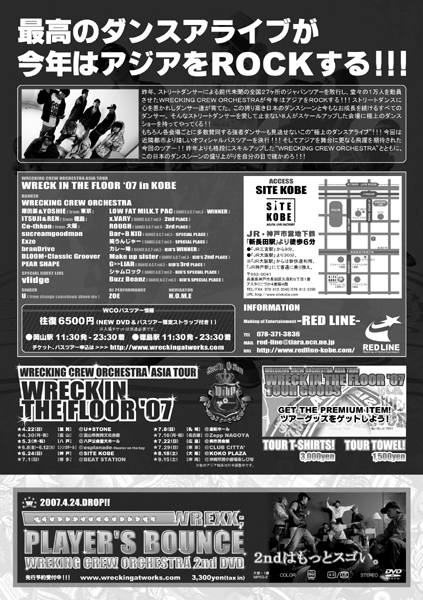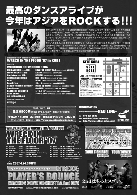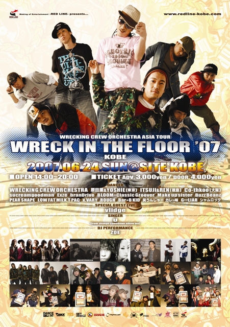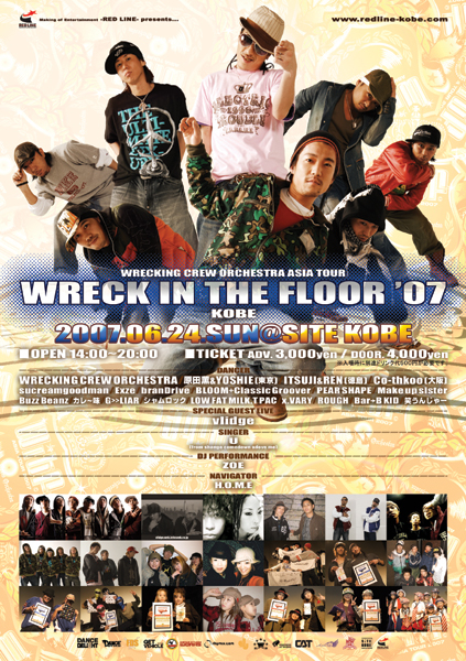 『WRECING IN THE FLOOR ’07』 DANCE & LIVE SHOW CASE 2007.06.24.SUN @KOBE SITE KOBE PM14:00〜PM20:00 ■内容■ 全国的にも有名なDANCERが集う WRECKING CREW ORCHESTRAの JAPAN TURE '07 IN KOBE ■日程■ 2007年6月24日(日) ■場所■ 神戸 SITE KOBE ■時間■ PM14:00〜PM20:00 ■チケット■ 前売 3,000円(別1ドリンク) 当日 4,000円(別1ドリンク) ■GUEST SINGER■ Vlidge ■SINGER■ U(from shango comedown adove me) ■DANCER■ WRECKING CREW