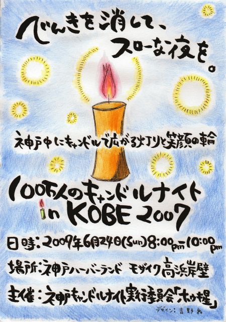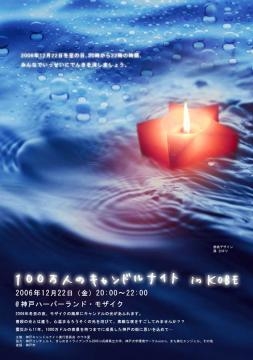こんばんは。 管理人のむっちーでーす。 神戸モザイクでキャンドルナイトを行います。 100万人のキャンドルナイトKOBE! ↓ コ ↓ ミ ↓ ュ ↓ http://mixi.jp/view_community.pl?id=1335857 『キャンドルで広がる笑顔の輪』 むっちーが代表を務める『ホウキ星』という団体主催で、ほとんどが学生です。 全員が有志で集まり、絶対成功させようと頑張ってます。 兵庫の南の大きなイルミネーションの町神戸。 その神戸は1000万ドルの夜景の町とも呼ばれています。 1日に1000万ドルの電気代がかかってると言われてます。