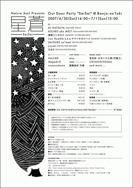管理人様、告知失礼致します。 不適切でしたら削除おねがいします。 6/30伊豆の山中の萬城の滝にて野外パーティを開催いたします。 西麻布YELLOW名物Party VOYAGEにて活躍のDJ KATSUYAを中心に東京で活動中のDJ、VJ、グラフィックアーティストが出演です。 入場料は寄付制度(カンパ)1000円です。ノベルティーCD付きです。 また地元中伊豆町との共催のイベントなので、地元の特産品 を存分に盛り込んだフードなども堪能出来ます。あくまでも 「フリー野外パーティー」ですが、これは贅沢過ぎです……。 中伊豆の自然と音を肴に一杯