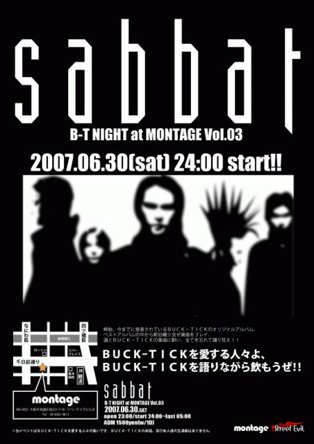 お待たせしました! 今月も「sabbat」開催です!! やっぱり今回も、今までに発表されているBUCK-TICKのオリジナルアルバム、ベストアルバムの中から新旧織り交ぜ楽曲をプレイ。 酒とBUCK-TICKの楽曲に酔い、全てを忘れて踊り狂え!! BUCK-TICKを愛する人々よ、 BUCK-TICKを語りながら飲もうぜ!! sabbat 〜B-T NIGHT at MONTAGE Vol.03〜 2007.06.30(sat) open 23:00/start 24:00〜last 05:00 ADM 1500yen(w/1D) 参加特典:特製sabbatカード 会場:montage 大阪市浪速区桜川1-7-30 リバーライズビル2F http://www.montage-l