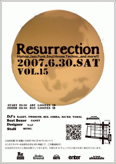 start 19:00 finish 26:00 Ticket: with flyer.\2000/2drinks day \2000/1drink (追加Drink:\1000/2drinks) Genre: HipHop, Jazz, Soul, R&B, House, Techno and more... DJs: resurrection regulars Kazzy Bee Twosuns Cobra Ma'ko tamai GANZY Live GANZY(human beat box) *20才未満の方の入場はお断りしております。ご了承下さい。 今年も半分が過ぎてしまおうとしています。 2007年上半期の締めくくりのresurrectionが近づいて参りました!! 今回はゲスト無しの100%resur