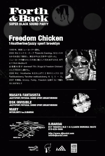FORTH&BACK 2007.6.30(SAT) @ DJBARDAI SPECIAL GUEST:::: Freedum chiken (14catherine/jazzy sport brooklyn) Freedom Chicken (14catherine/jazzy sport brooklyn): 1999年、単身ニューヨークへ渡米。2000年にミックス・テープ『Quixotic Evening』をセンスのわかるお店にて販売し、東北を中心に日本中へ広まった。 ニューヨークの最もセンスの良い箱として名をあげられるAPTにてRich Medinaの全信頼を受けdownwell 79's(Koga & Freedom Chicken)としてROCKし続けた。 2006年に14catherineを立ち上げて2枚のミックスCD『welldu