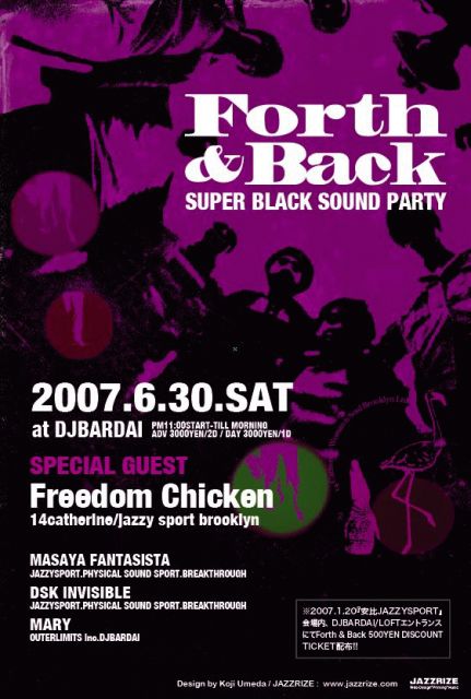 FORTH&BACK 2007.6.30(SAT) @ DJBARDAI SPECIAL GUEST:::: Freedum chiken (14catherine/jazzy sport brooklyn) Freedom Chicken (14catherine/jazzy sport brooklyn): 1999年、単身ニューヨークへ渡米。2000年にミックス・テープ『Quixotic Evening』をセンスのわかるお店にて販売し、東北を中心に日本中へ広まった。 ニューヨークの最もセンスの良い箱として名をあげられるAPTにてRich Medinaの全信頼を受けdownwell 79's(Koga & Freedom Chicken)としてROCKし続けた。 2006年に14catherineを立ち上げて2枚のミックスCD
