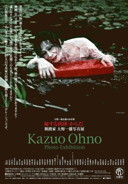 大野一雄生誕100年祭 大野一雄写真展「秘する肉体(からだ)」 横浜展 ■会期 2007年6月29日(金)〜7月10日(火) 午前10時〜午後6時(最終日のみ午後5時終了) ■開催記念イベント 「大野慶人ギャラリートーク+舞踏」 2007年6月30日(土)午後2時〜午後3時 参加無料:定員30名(先着順) http://www.yurindo.co.jp/info/gallery.html ■会場 有隣堂ギャラリー (横浜・伊勢佐木町本店「書籍館」地階) JR関内駅北口・横浜市営地下鉄関内駅下車 TEL045-261-1231 http://www.yurindo.co.jp/shop/syosekikan.html 大野一雄写真展