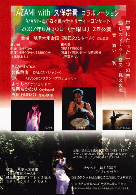 *世界遺産の島、屋久島出身アーティストAZAMIの コンサート案内をさせていただきます。 *心ときめく日、音獲ダンスのコラボレーション *AZAMIwithダンサー群青コラボレーション 2007年6月30日(土曜日)2回公演 会場 /岐阜未来会館(県民文化ホール) 岐阜市学園町3丁目42番地 058−296−0888 昼の部/会場13時30分 開演/14時00分〜16時00分 (休憩あり) 夜の部/会場17時00分 開演/17時30分〜19時30分 (休憩あり) 屋久島の映像を流します。 出演者 AZA