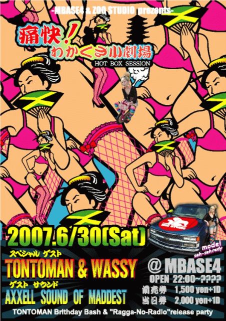TONTOMANのBirthday Bash! 痛快! わかくさ小劇場 〜HOT BOX SESSION〜 第二幕 @上牧MBASE4 ■OPEN 22:00 ■CLOSE ????? 前売 1,500円 (1ドリンク付) 当日 2,000円 (1ドリンク付) 【Special GUEST】 TONTOMAN(栃木) & WASSY(埼玉) *TONTOMAN from TASTEE DISCO 【GUEST SOUND】 AXXELL SOUND(大阪) -座長代理- DADA *座長只今修行中! 【SOUND】 MBASE4 SOUND CLASSIC RUDY JELLY FISH JAH TRAIN 【rub-a-dub】 MOUNTEN KING Munch Rock PHATTY-B 翔麻