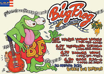 日本のトップ Jam Bandの【BIG FROG】が 九州ツアーの最後を佐賀で締めくくります しかも、週末でーっす、思いっきり逝けますねっ @RAG−Gにて、 OPEN 19:30 START 20:00 Adv.\2500 / Door \3000,,, (+500yen for 1D) info:HARVEST 0952-26-5832 B.F情報↓ http://www.bigfrog.jp/ http://www.myspace.com/bigfrogjp http://mixi.jp/view_community.pl?id=47292 っとまぁ、情報的にはこんなですが。 個人的には、初ライブから早何年でしょう。 毎回のごとく、九州ツアーでは佐賀まで やってく