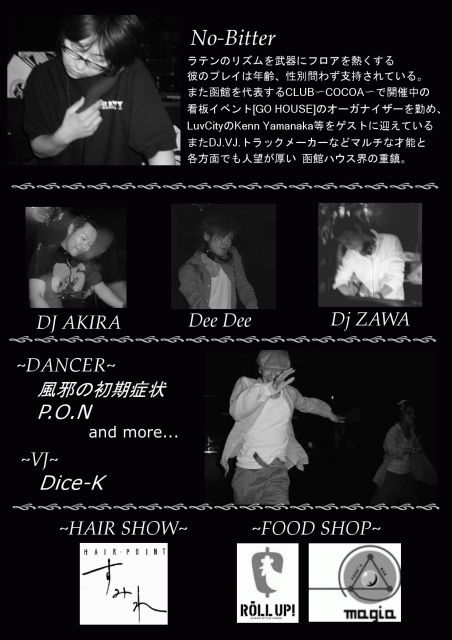 千歳発のHouseMusicOnlyEvent 今回も盛り沢山の内容でお送りします! そして函館HOUSE界の最重要人物 No-Bitterが登場♪ これは見逃せないぞw 【 HOUSE GROOVE 6 】 Presented by CottonClub J 【日程】 7/20(金) PM9:00 Start〜 【場所】 CottonClub J 千歳市錦町 1-12-8 080-5594-6949 【J HomePage】 http://ip.tosp.co.jp/i.asp?i=cotton_club_j 【入場料】 \1,000 エントランス(受付)にて フライア提示して頂くと 1Drink&No-Bitterのmix CDプレゼント!!!!!! 【協賛】 =HAIR POINT すみれ