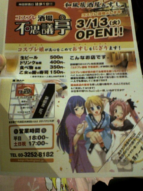 14日は13時〜17時で練習します たぶん暑いと思うので、暑さ対策は忘れずに〜〜 練習後は、萌え系のお店にいく予定ですぅ コスプレ酒場「不思議亭」だぉ オネーチャンが寿司にぎってくれるみたいです 夏のボーナス使いまくろうYO