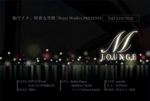 めでたく定員に達しましたので、WEB予約は閉切らせていただきます。 どうもありがとうございます♪ Happy MonKey presents M-Lounge ロマンチックな夜景とハッピーな音楽でもてなす船上パーティ。心地よい風を受けながらオープンエアーで楽しむ音楽イベントは、DJと夜景がシンクロするスーパーハイテンションなスペシャルナイト。織り姫とひこ星が見守る空の下、一年に一度の七夕は東京湾クルーズで。 2007.07.07(sat) BOAT「IRIS」 19:15 日の出桟橋出港 (ゆりかもめ 日の出桟橋駅から徒歩1分) 18:00 受付開始(