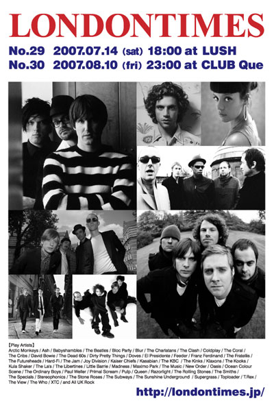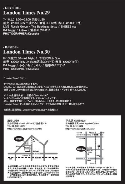 いよいよGIG SIDEが来週に迫りました! 今回は3バンド+オープニングアクト1人です。 もちろんDJタイムもあります。 お楽しみに! -GIG SIDE- “London Times No.29” 日時:7/14(土)18:00〜22:00 会場:渋谷LUSH 03-5467-3071 住所:渋谷区渋谷1-10-7グローリア宮益坂?B1 http://www.toos.co.jp/lush/ 前売:\2000(1d&出演バンド音源付) 当日:\2000(1d付) ※質問等こちらでお気軽にお問い合わせ下さい。 ukrockyou@yahoo.co.jp Live:Russia Group/The Backhead Jetty/SNEEZE Opening Act:G*I! HyperVersion