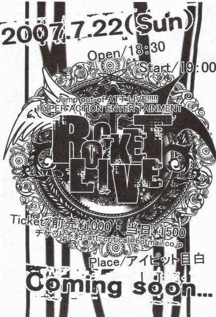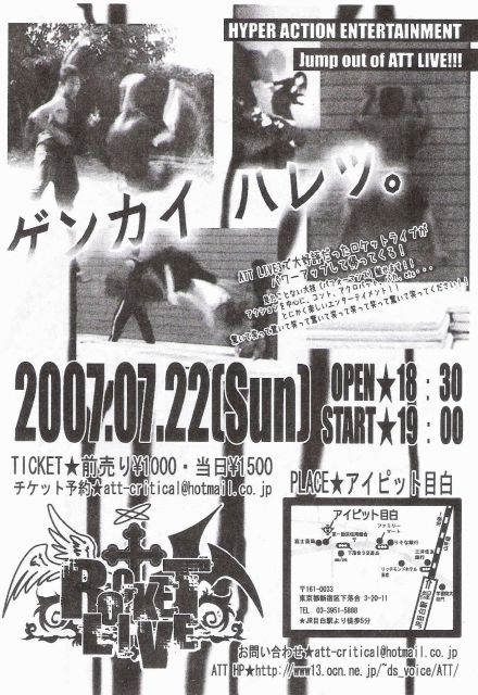 【ATTROCKETLIVE】 2007/7/22/(sun) 19:00start! atアイピット目白 ― ゲ ン カ イ ハ レ ツ ― HYPER ACTION ENTERTAINMENT jump out of ATTLIVE!!! ATTLIVE3で好評だったロケットライブがパワーアップして帰ってくる! 見たことない大技(パフォーマンス)魅せます!! アクションを中心に、コント、アクロバット、バカ、etc… とにかく楽しいエンターテイメント!! 驚いて笑って驚いて笑って驚いて笑って笑って笑って驚いて笑ってください!! 夏を熱くさせます、ATT!