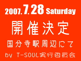 出演アーティストの募集を開始しました! また、ボランティアや実行委員会メンバーも 募集してま〜す。 どうぞ宜しくお願いっ! ____________________ 今年もやりますT−SOUL! 昨晩、2007年初のT−SOUL実行委員会・全体会議が行われ、第4回目となる真夏の野外音楽祭T−SOULを7月28日(土)に開催することが承認されました〜。 昨年同様、国分寺駅周辺の特設野外ステージで、アーティスト、オーディエンスが熱く盛り上がり、フード・CD・グッズコーナーでは個性的なSHOPが夏祭りを演出す