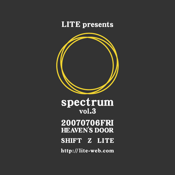 2007/7/6(fri)@三軒茶屋HEAVEN'S DOOR "LITE presents「spectrum vol.3」" ・LITE ・SHIFT http://www.shift-japan.info/ http://mixi.jp/view_community.pl?id=707387 ・Z http://mixi.jp/view_community.pl?id=670194 OPEN 18:30/START 19:00 ADV ¥2,000/DOOR ¥2,500 LAWSON TICKET(Lコード:32666) チケット予約は lite_ticket@hotmail.co.jp まで ※お名前、枚数をご記入下さい。 2年半振りのLITE企画にふさわしい激アツなバンドが そろいました!!! いよいよ ですよ!!!