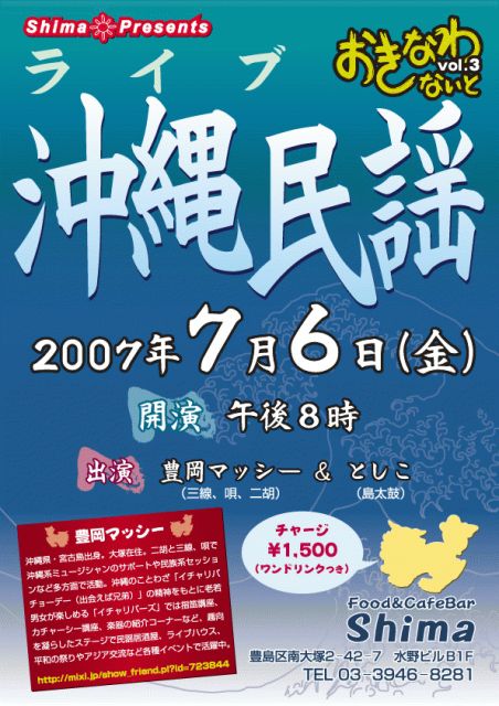 7月6日(金)は「おきなわないとVol.3」です。 大塚♪SHiMa☆♪ 週末のライブイベントは「おきなわないと」。豊岡マッシー&としこさんは、4月に続き早くも2回目の登場です。 マッシーさんたちの奏でる二胡、三線、島太鼓と心ふるわす島唄、そして爆笑トークに乗せられて、いつしかあなたもカチャーシーの輪の中に…… 期日:7月6日(金)20:00より(途中入場OK!) チャージ:1500円(ワンドリンク付き) 場所:フード&カフェバー♪SHiMa☆♪ 電話番号:03-3946-8281 (お店の地図などはこちらでご確認ください) http: