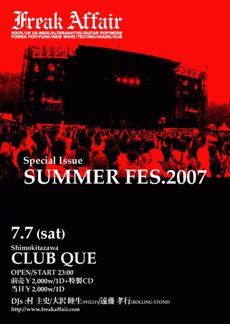 『FREAK AFFAIR』 7/7(SAT) DJ/ 村 圭史 大沢睦生(willy/british pavilion) 遠藤孝行(ROLLING STONE) OPEN&START 23:00 前売?2000(1DRINK+特製CD) 当日?2000(1DRINK) @下北沢CLUB QUE [問]QUE 03-3412-9979 18歳未満の方は入場できません。 逆に言うと18歳以上ならOKってことです。 今回の特集は、今年も開催が決定し、出演者もほぼ出揃ったFUJI ROCK、SUMMER SONICを中心とした夏フェス2007です。 毎度恒例のテキーラ・ショットガン・サービスや、 フリークのDJが「今」の気分をコンパイルしたCDを 前売り購入&先