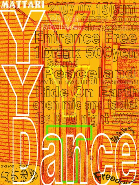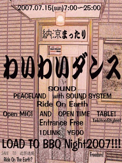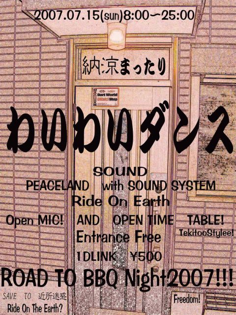 わいわいパーチーやります。 みなさんお誘いあわせの上、汗かきましょう。 BBQ前のイベントですので 初めて行く人はここでみんなとちょっと知り合いになれたら もっと楽しくなるんではないでしょうか? とは限らず、 ただただ、てきとうな感じでまったり夏の夜を楽しみましょう!!! なお、外に出ての馬鹿笑い、馬鹿騒ぎは控えましょう。 もちろん、喧嘩や争いごとなしのLOVE AND PEACEで CLEAN HARTでね! 2007年07月15日(20:00〜25:00) 入場無料(1Drink=\500) 千葉県長生郡一宮町海岸通りY.Y.T