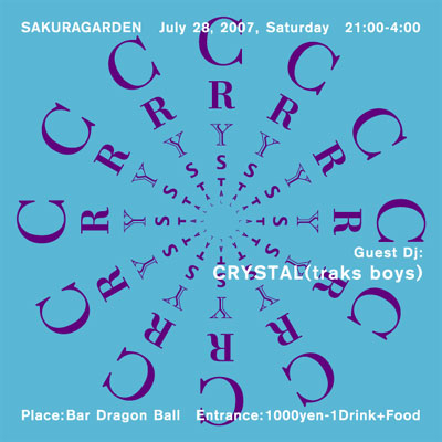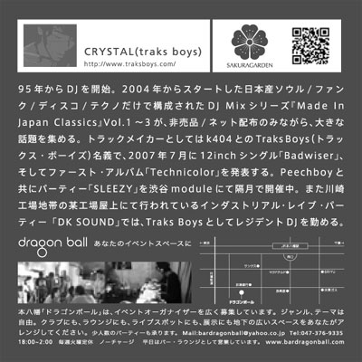 Traks Boysのアルバム発売直後です ぜひ遊びに来て下さい SAKURAGARDEN http://www.sakuragarden.jp 2007/07/28(SAT) 21:00-4:00 Place:Bar Dragon Ball http://www.bardragonball.com Entrance: 1000yen-1Drink+Food Guest Dj: CRYSTAL(Traks Boys) http://www.traksboys.com/ DJ: Wataru Sakuraba Nii JO-G MOZE(ITP) VJ:Deepupa FOOD:Yumiko ◎ Crystal(クリスタル) 95年からDJを開始。2004年からスタートした日本産ソウル/ファンク/ディスコ/テクノだけで構成されたDJ Mixシリーズ『Made In Ja