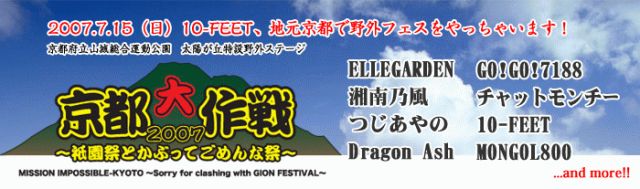 京都出身のアーティスト「10-FEET」の企画された野外フェス。 GO!GO!7188等、多数アーティストが参加。 出演アーティスト(予定) ELLEGARDEN GO!GO!7188 湘南乃風 チャットモンチー つじあやの 10-FEET Dragon Ash MONGOL800 ...and more!! 詳しくは↓↓↓ サウンドクリエーター (TEL:06-6357-4400) オフィシャルサイト http://www.sound-c.co.jp/closeup/mi-kyoto/index.html 10-FEETのオフィシャルサイト http://www.10-feet.com/