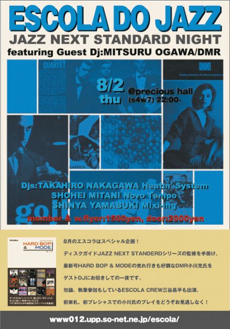 札幌PRECIOUS HALLにて、現在でも毎月ESCOLA DO JAZZというイベントを続けさせていただいており、8/2には"JAZZ NEXT STANDERD NIGHT"と題してDMRの小川充氏をゲストにお招きします。
