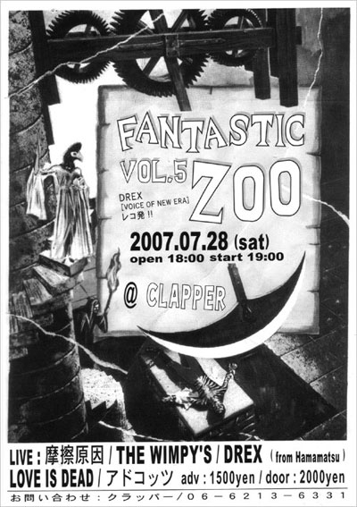 摩擦原因 presents "FANTASTIC ZOO vol.5" [ ACT ] LOVE IS DEAD 摩擦原因 THE WINPY's アドコッツ DREX (f.浜松) [ OPEN / START ] 18:00 / 19:00 [ ADV / DOOR ] \1,500 / \2,000 (+1DRINK) 【心斎橋 CLAPPER】 http://clapper.jp/ 〒542-0086大阪市中央区西心斎橋2-10-34 心斎橋ウエスト363ビル B1F TEL:06-6213-6331