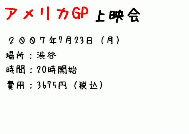 7月23日に朝5:30から放送のアメリカGPを録画して 夜にスポーツバーで見ようと考えています まだ何も決まっていないけど 大画面で見たい人 大勢で見たい人 早起き出来ないので録画して見る人 早朝見たけど夜に2回目見たい人 綺麗に録画できてDVDに焼ける人 大募集です もちろん見るだけの人も大募集です! 全員ゴールするまでネタバレは無しです P.S.お勧めのお店があったら教えてください