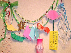 折り紙で短冊や飾りを作り、願いごとを書いて飾ります。 本物の笹も少し入手する予定です 手作りしたものは、お持ち帰りいただきます 皆さんのご参加お待ちしていま〜す 参加費:300円程度の予定(折り紙、ひも、ビニールテープ、笹代など) 持ち物:ペン、ハサミ、のり、セロテープ、持ち帰り用の袋、飲み物 写真1:完成のイメージです。 写真2:あみかざりの作り方です。