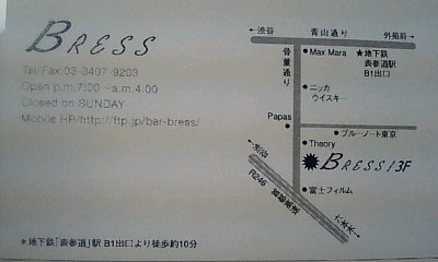 この度「BRESS aoyamaコミュ」の管理人が私「えびる」になりました♪ 今まで管理人でした「ぶれす☆」さんと代わり、お会いして居ないメンバー様との交流を持つべく本人主催の「襲名ぱーちー」と言う名のただのオフ会と言う噂もございますがw開催させて頂きます。 メンバー様のみならずお友達お誘い合せの上、お気軽にご参加ご来場下さい♪ 一応お酒をお出しする場所ですので、参加条件20歳以上とさせて頂きます。 日時:7月21日(土)20時〜23時30分(会の区切りとして終電前に終わらせます) 場所:BRESS aoyama 内