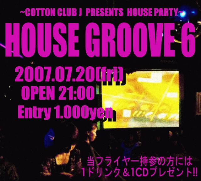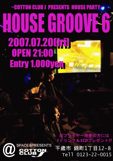 千歳発のHouseMusicOnlyEvent 今回も盛り沢山の内容でお送りします! そして函館HOUSE界の最重要人物 No-Bitterが登場♪ これは見逃せないぞw 【 HOUSE GROOVE 6 】 Presented by CottonClub J 【日程】 7/20(金) PM9:00 Start〜 【場所】 CottonClub J 千歳市錦町 1-12-8 080-5594-6949 【J HomePage】 http://ip.tosp.co.jp/i.asp?i=cotton_club_j 【入場料】 \1,000 エントランス(受付)にて フライア提示して頂くと 1Drink&No-Bitterのmix CDプレゼント!!!!!! 【協賛】 =HAIR POINT すみれ