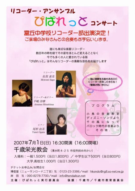 はじめましてリコーダーアンサンブル「ぴぱれっと」の代表をしています 「もとみ」 と申します。 この度 7月1日(日)千歳栄光教会でコンサートを行う事が決定いたしました。 私は 今横浜に住んでいますが 信濃小学校 富丘中学校 千歳高校 と学生生活を千歳で過ごしてまいりました。 やはり千歳は私にとって大切なところです。 大好きな千歳で演奏が出来る事をとても幸せに思っています 「千歳栄光教会」は、清水町4−25 (市役所斜め向かい)です。 今年で千歳での演奏は4回目を迎えます。 これも岸田