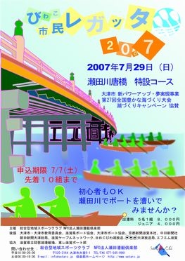 7/1現在、申込みクルー45クルー 60クルーを目指しています。7/7まで受付中!! 実施要項 主催 総合型地域スポーツクラブ NPO法人瀬田漕艇倶楽部 後援 大津市・大津市教育委員会、滋賀県ボート協会、大津市ボート協会 京都新聞滋賀本社、中日新聞社、朝日新聞大津総局 滋賀ケーブルネットワーク、BBCびわ湖放送、NHK大津放送局、エフエム滋賀 協力 滋賀県立琵琶湖漕艇場、東レ滋賀ボート部 開催日 2007年7月29日(日)9:30〜16:00(受付8:30〜) 少雨決行 但し、主催者が自然災害(大雨、強風、川の増水等
