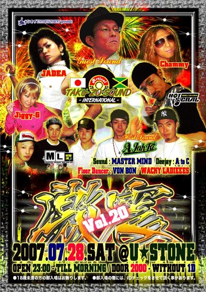 月一のお祭りといえば激震です! 飲めまっせー♪踊れまっせー♪ 変な輩は即退場させます! しつこいナンパにはなまずSTAFFがガツンと言うたります! 是非おいでやす♪ なまずENTERTAINMENT PRESENTS 《激震》Vol.20 7・28(SAT)@U★STONE OPEN/START 23:00 CLOSE5:00 『TICKET』 DOOR \2000(Without1D/\500) 18歳未満入場不可(要ID持参) 『GUEST SOUND』 TAKU-ZO SOUND 『SOUND』 HOT SIGNAL MOTHER LAKE MASTER MIND 『HOST SOUND』 A JAH Ri 『DANCER』 JADEA Chammy Jiggy-G 『FLOOR DANCER』 VON BON CREW