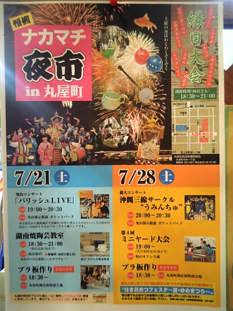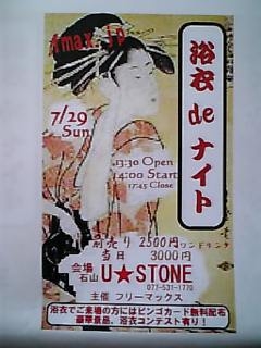 やっとフライヤーが出来ました (マックが小さいから、ちょっと不満です) 場所:滋賀県近江八幡駅前 COCOZA 日時:昭和82年7月21日(土) OPEN 17;00 START 17:30 チケット:前売り 3000円 当日 3500円 (別にドリンク代 500円) 〒523−0898 滋賀県近江八幡市鷹飼町南4−5 BON.DENEMON 3F ?0748−38−8586 HP http://homepage2.nifty.com/cocoza/ チケットをご希望の方は僕まで連絡下さい。 mixiメー