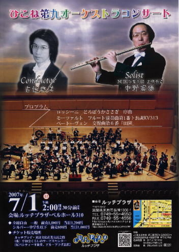 指揮 吉住典洋 独奏 中野富雄(N響フルート主席奏者) 曲目 ロッシーニ どろぼうかささぎ 序曲 モーツァルト フルート協奏曲第1番ト長調KV313 ベートーヴェン 交響曲第6番「田園」