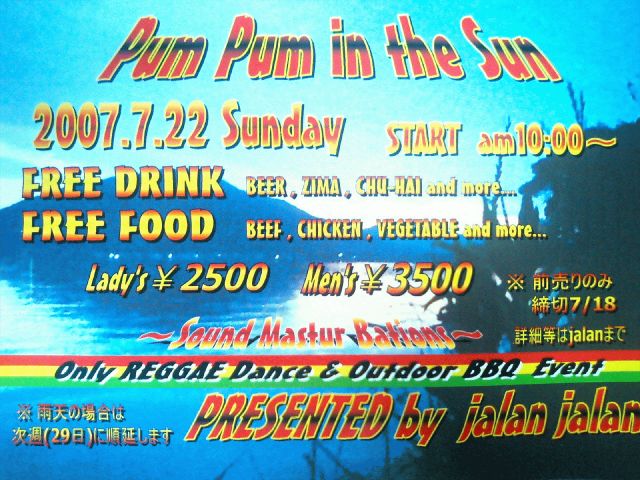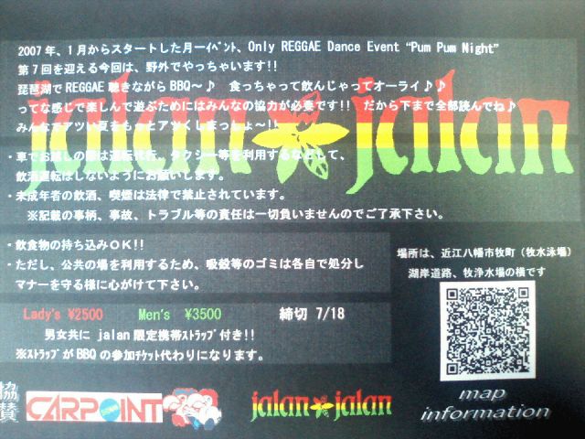 2007年1月からスタートした月一イベント Only REGGAE Dance Event “Pum Pum Night” 第7回を迎える今回は 野外でやっちゃいます!! 琵琶湖でREGGAE聴きながらBBQ〜♪ 食っちゃって飲んじゃってオーライ♪♪ (BBQがメインだったりします笑) ってな感じで楽しんで遊ぶためには 参加者みんなの協力が必要です!! だから注意事項をしっかり読んで 守って下さいな ・車でお越しの際は運転代行、 タクシー等を利用するなどして、 飲酒運転はしないようにお願いします。 ・未成年者の飲酒、喫煙は法