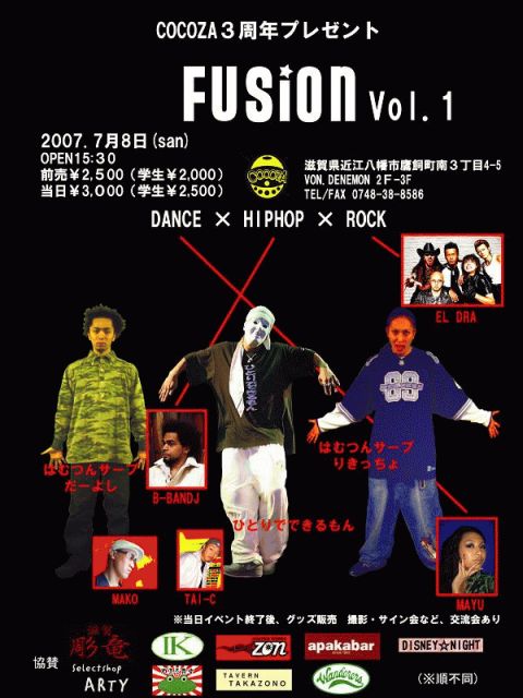 COCOZA3周年プレゼント第一弾! FUSION vol、1 滋賀県近江八幡市 ライブハウス「COCOZA」 http://homepage2.nifty.com/cocoza/ DANCE×HIPHOP×ROCK 15:30〜OPEN 16:00〜STRAT GEST ひとりでできるもん (DANCE) ダンス番組「少年チャンプル」13週連続1位の覆面ダンサー。今やダンス界の中でも知らない人はいない程の有名ダンサー!! はむつんサーブ (DANCE) ダンス番組「少年チャンプル」出演中。数々のコンテストでは優勝や入賞を招く。現在のアニメーションダ