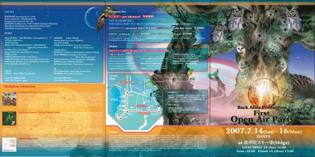 △Back Alley Production First Open Air Party△ 2007 / 7/14 (Sat)〜16 (Mon) @奥伊吹スキー場 (Shiga) http://www.okuibuki.co.jp GATE OPEN 14th (Sat) 16:00 Start :18:00 Finish :16th (Mon) 13:00 3DAYS PARTY!! *先行前売りチケット 4000円 (6/4〜6/12迄、限定150枚 先行前売りチケットご希望の方はお名前、電話番号、チケット枚数、チケット送付先を明記しbackalleyproduction@hotmail.co.jpまで連絡下さい) *前売りチケット \5500 *当日チケット \7000 いずれのチケットも二泊三日の通しチケットとな