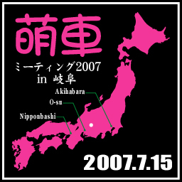 2007年7月15日。 世界初(多分…) 行政に許可を取ってまでやる… 痛車・痛単車乗りの 痛車・痛単車乗りによる 痛車・痛単車のオンリーイベント… 【萌車ミーティング2007in岐阜】 を開催します。何かのイベントに便乗ではなく、 痛車・痛単車オンリーのイベントして開催します。 このイベントで何が出来るか解りませんが、 ひとつの通過点になれたらいいなと思っております。 ココでは告知のみになりますので詳細・受付・質問などは公式サイトにて… http://anime.g