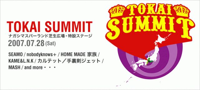 TOKAI SUMMIT開催決定! ついに夏のビックイベントが開催決定!その名も『TOKAI SUMMIT』! 日時:2007年7月28日(土) OPEN 15:00 START 16:00 END 20:00(予定) 場所:ナガシマスパーランド芝生会場・特設ステージ 出演:SEAMO, HOME MADE家族, KAME&L.N.K, カルテット, 手裏剣ジェット, MASH and more... 料金:前売/?5,800(ブロック指定・税込)(ナガシマスパーランド遊園地入場料込) 当日/?6,300円(税込) ※3歳以上有料・3歳未満入場可 チケット: 2007年6月16日(土) AM10:00〜 主催:TOKAI SUMMIT事務局 問合せ:ZOOMenterpr