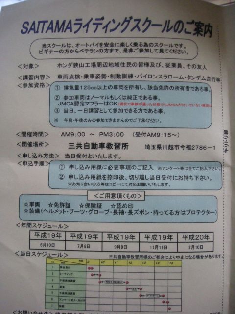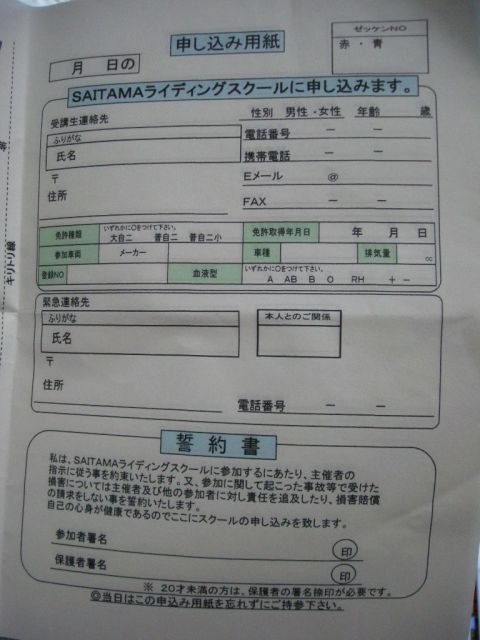 予約なし 当日申し込みです。 無料です 飯なし 自分のバイクで参加! (125?以上) うるさいマフラーだと 参加できないかも せめて JMCAで お願いします。 9:00受付 8:45くらいから 集まりだす 9:30受付終了 から 15:00まで 勉強できます。o(≧▽≦)o 内容は 運行前点検 乗り方 目線とかね 急制動 1本橋 千鳥走行とか 基本は コーススラロームです。 初心者を相手にした 講習と思ってください。 http://www.sankyo-ds.co.jp/map.html 場所わかりずらい