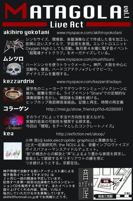初めまして、黒糖きなこと言います。 明日、神戸otoyaで気持ち悪いパフォーマンスをします。皆様どうぞお越しください。 7/11 MATAGOLA vol.1 @club 音屋 18:30open19:00start22:00close 【akihiro yokotani】 www.myspace.com/akihiroyokotani シンセサイズ、環境音、楽器演奏などで作成した音を加工し、即興に近いスタイルで、宇宙感を表現。エレクトロユニットOxygen Highとしても活動。毎月第4水曜日に電子音イベント「超電導ナイトクラブ」をオーガナイズしている。 【ムシツロ】 www.myspace.com/mushitsuro ハード