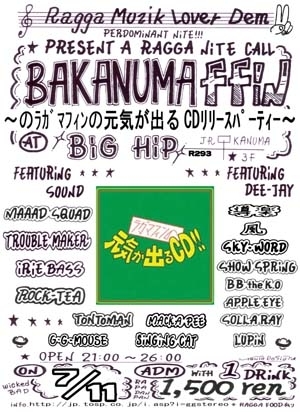 今月は7月11日第二水曜日になりました。 お間違いなく 「ラガマフィンの元気が出るCD」リリースPARTY GUEST SOUND ☆MAAAD SQUAD From東京 ☆TROUBLE MAKER From宇都宮 GUEST DEEJA ☆TONTOMAN ☆風 ☆道楽 ☆SHOW SPRING ☆BB The K,O ☆SKY WORD LUPIN MACKA PEE GG MOUSE SINGING CAT SOUND IRIE BASS ROCK−TEA