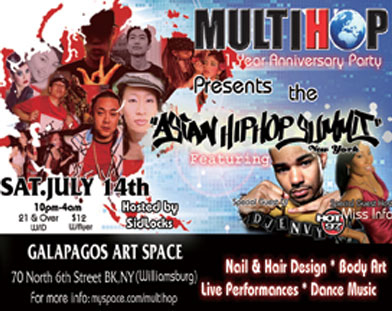 今回は1周年を記念してあのHip Hopが住みつくラジオステーション"HOT 97"からスペシャルゲストにDJ ENVYとMiss Infoを迎え豪華なラインナップで開催される。さらにASIAN HIP HOP SUMMITと題して多くのアジア人のパフォーマンスが行われる。熱い夜を見逃すな!!