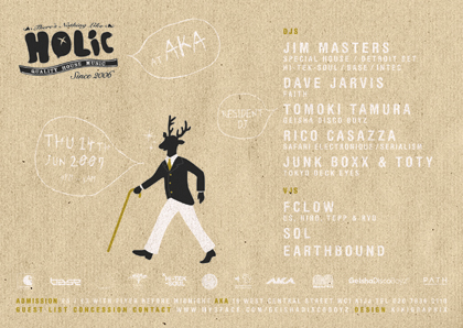 HOLICです。Guest djにはつい最近japan tourを大成功させたCarlCoxの相方でも有名であり、現在はDerickMayの相方として世界一のクラブMinistory of soundのメインdjを勤めるJimMastersとLondonのDisco,House界を長年にわたって支え続けてるFaithのDiscoドンDave Jarvis。この異例な組み合わせは既にロンドンのクラブシーンで話題を呼んでいます。