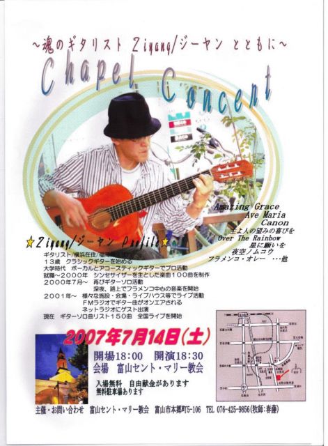 6月23日の「Zi PRO」設立記念ライブで、 「Zi PRO」としての音楽活動がいよいよスタート!! まずは、全国ライブ第1弾は、富山で Chapel Concertということで入場は無料。 「Amazing Grace」などの賛美歌、クラシック、オリジナルなど、大聖堂の中でのジーヤンギターをお届けします。